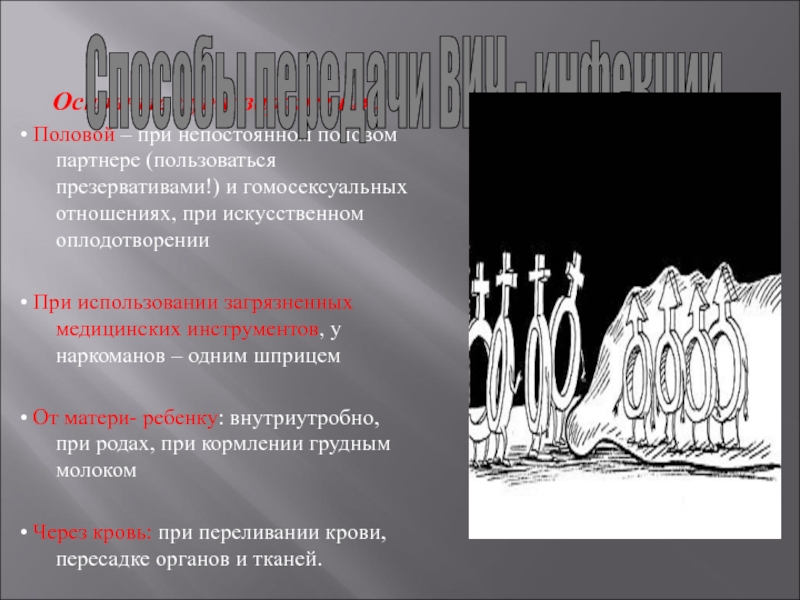 • Половой – при непостоянном половом партнере (пользоваться презервативами!) и гомосексуальных отношениях, при искусственном оплодотворении
