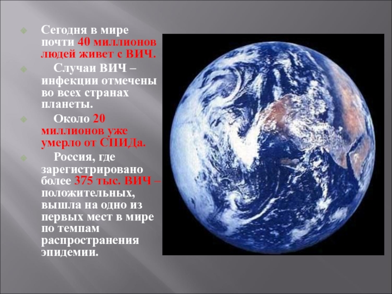 Случаи ВИЧ – инфекции отмечены во всех странах планеты.