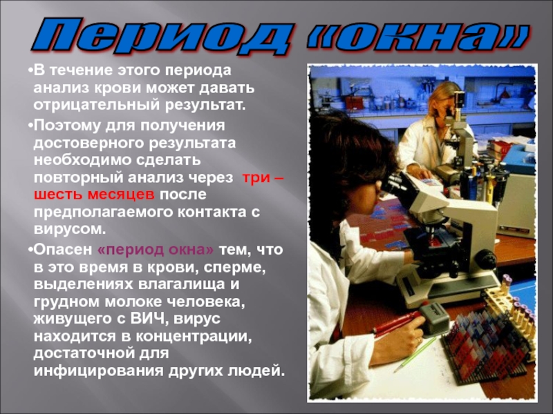 Опасен «период окна» тем, что в это время в крови, сперме, выделениях влагалища и грудном молоке человека, живущего с ВИЧ, вирус находится в концентрации, достаточной для инфицирования других людей.