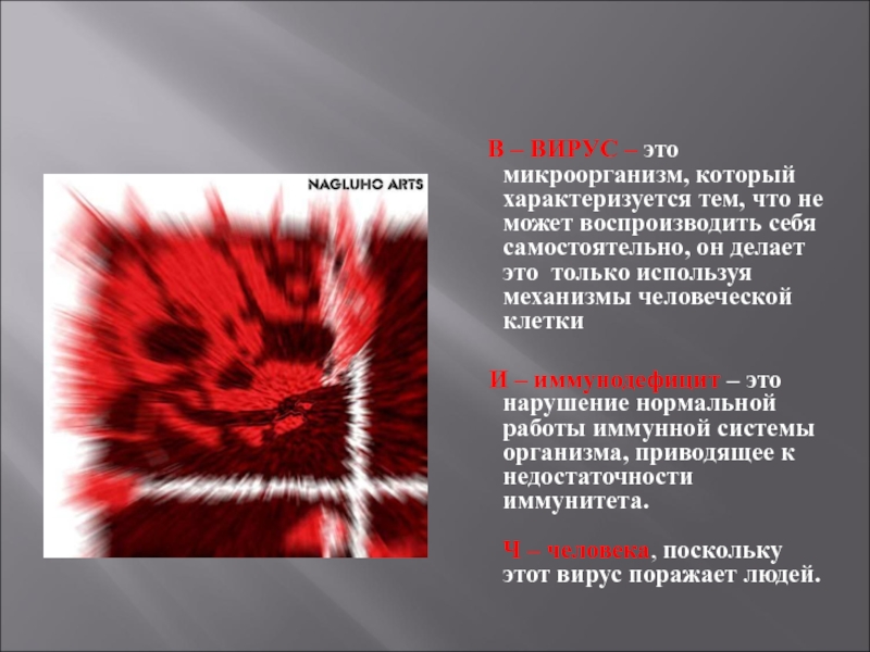 В – ВИРУС – это микроорганизм, который характеризуется тем, что не может воспроизводить себя самостоятельно, он делает это только используя механизмы человеческой клетки