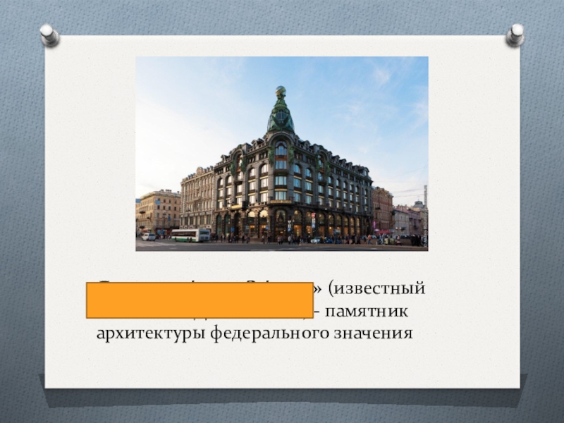 Слайд 15Дом компа́нии «Зи́нгер» (известный также как «Дом кни́ги») - памятник архитектуры федерального