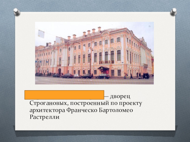 Слайд 16Стро́гановский дворе́ц — дворец Строгановых, построенный по проекту архитектора Франческо Бартоломео Растрелли
