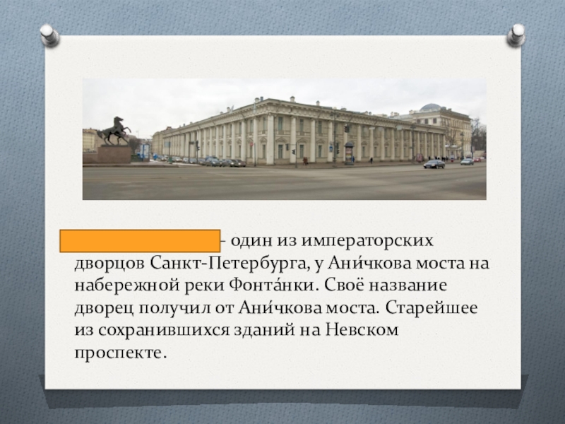 Слайд 21Ани́чков дворе́ц— один из императорских дворцов Санкт-Петербурга, у Ани́чкова моста на