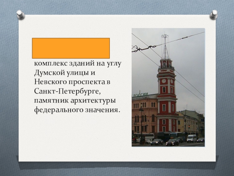 Слайд 19Здание Городской думы с башней — комплекс зданий на углу Думской