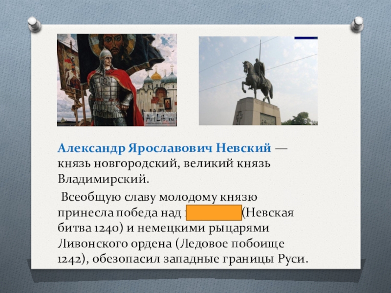 молодому князю принесла победа над шведами (Невская битва 1240) и немецкими рыцарями Ливонского ордена (Ледовое побоище 1242), обезопасил западные границы Руси.
