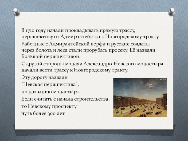 Слайд 5В 1710 году начали прокладывать прямую трассу, першпективу от Адмиралтейства к