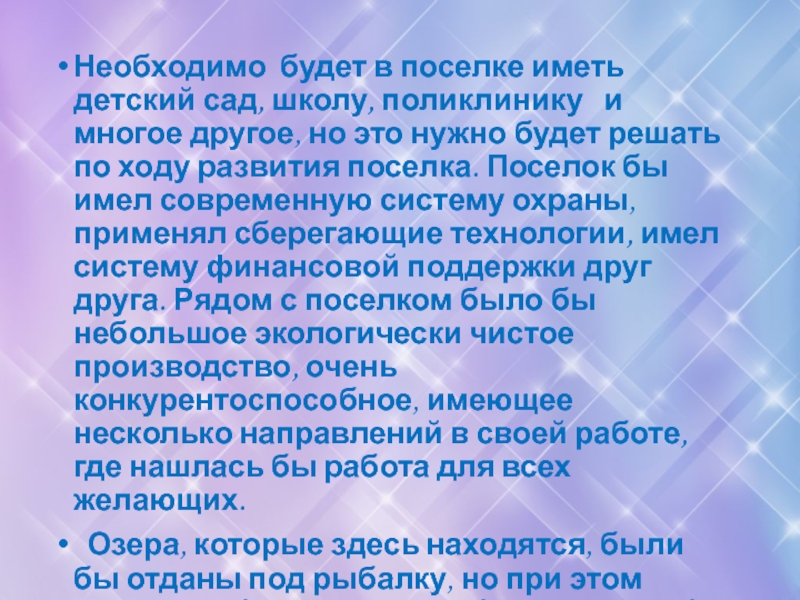многое другое, но это нужно будет решать по ходу развития поселка. Поселок бы имел современную систему охраны, применял сберегающие технологии, имел систему финансовой поддержки друг друга. Рядом с поселком было бы небольшое экологически чистое производство, очень конкурентоспособное, имеющее несколько направлений в своей работе, где нашлась бы работа для всех желающих.