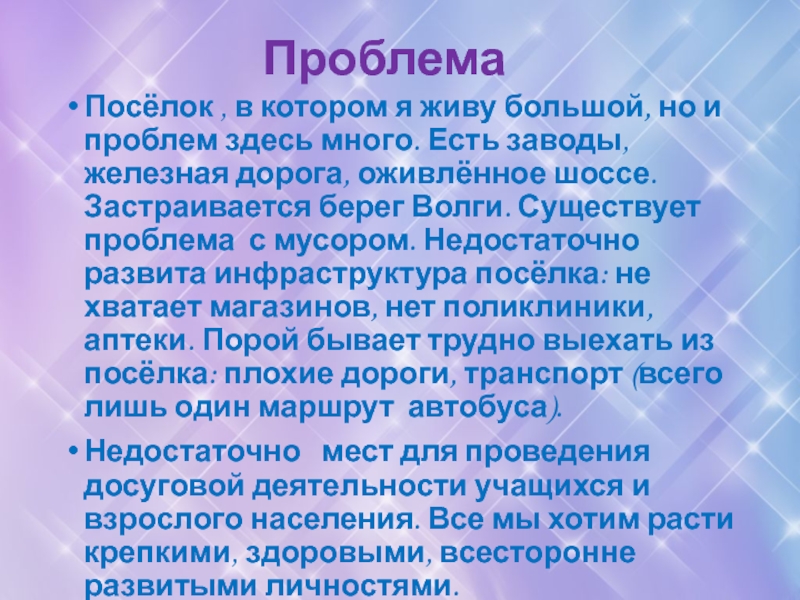 Недостаточно мест для проведения досуговой деятельности учащихся и взрослого населения. Все мы хотим расти крепкими, здоровыми, всесторонне развитыми личностями.
