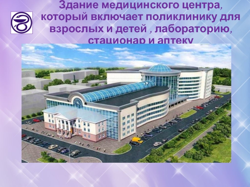 Слайд 21Здание медицинского центра, который включает поликлинику для взрослых и детей ,