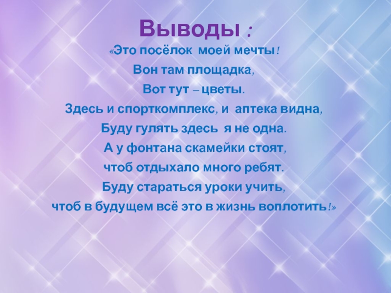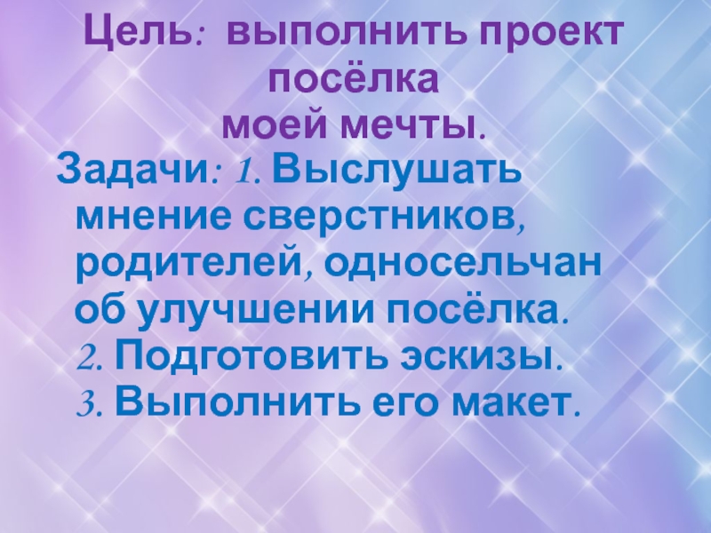 односельчан об улучшении посёлка. 2. Подготовить эскизы. 3. Выполнить его макет.