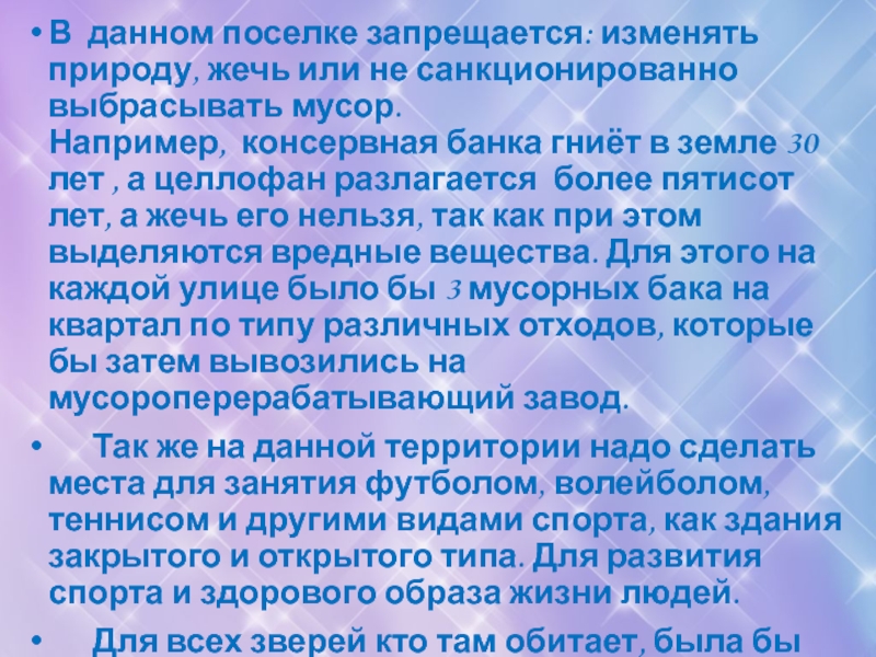 Слайд 9В данном поселке запрещается: изменять природу, жечь или не санкционированно выбрасывать мусор.