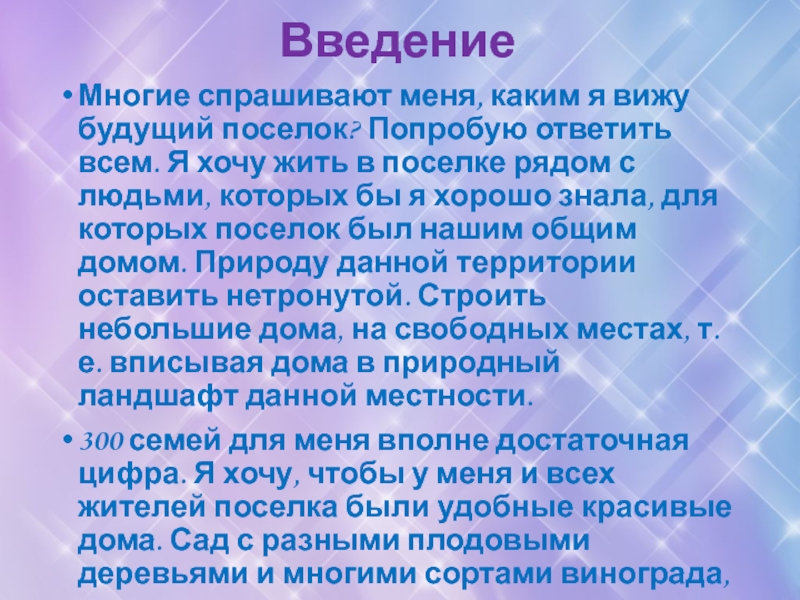300 семей для меня вполне достаточная цифра. Я хочу, чтобы у меня и всех жителей поселка были удобные красивые дома. Сад с разными плодовыми деревьями и многими сортами винограда, огород с экологически чистыми овощами, чтобы росли красивые цветы и был маленький водоем с красивыми рыбками.
