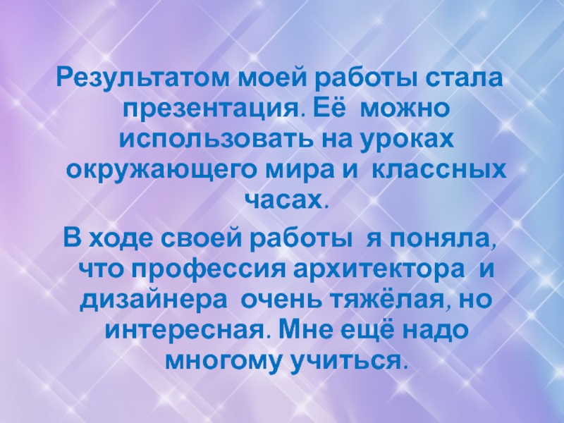 В ходе своей работы я поняла, что профессия архитектора и дизайнера очень тяжёлая, но интересная. Мне ещё надо многому учиться.
