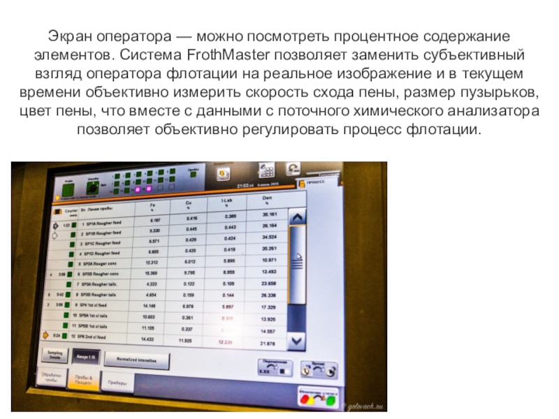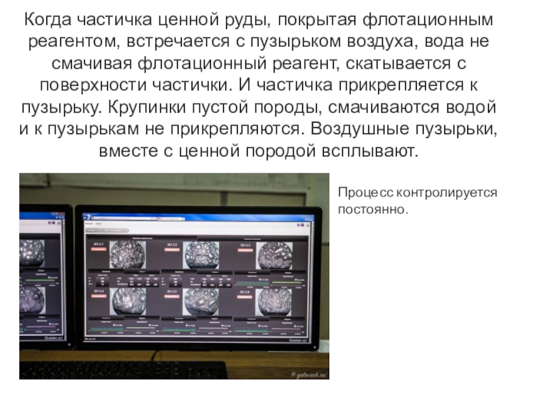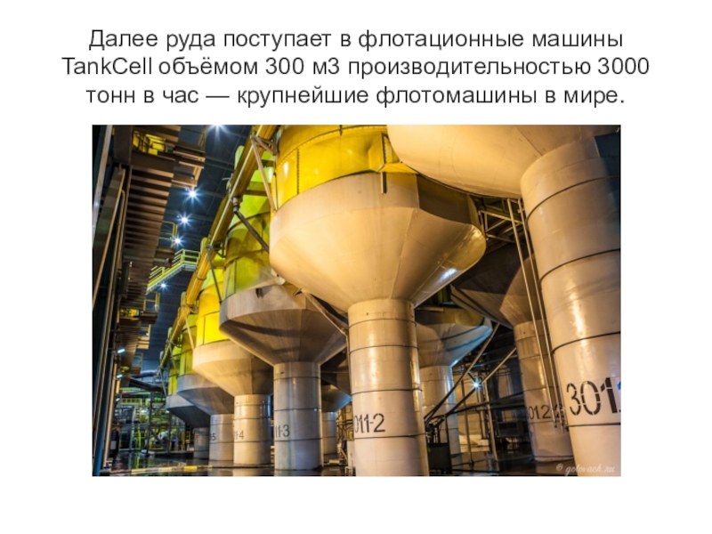 После смешения, в пульпу подаётся воздух. Воздушные пузырьки всплывая, цепляют на себя частички ценной руды.