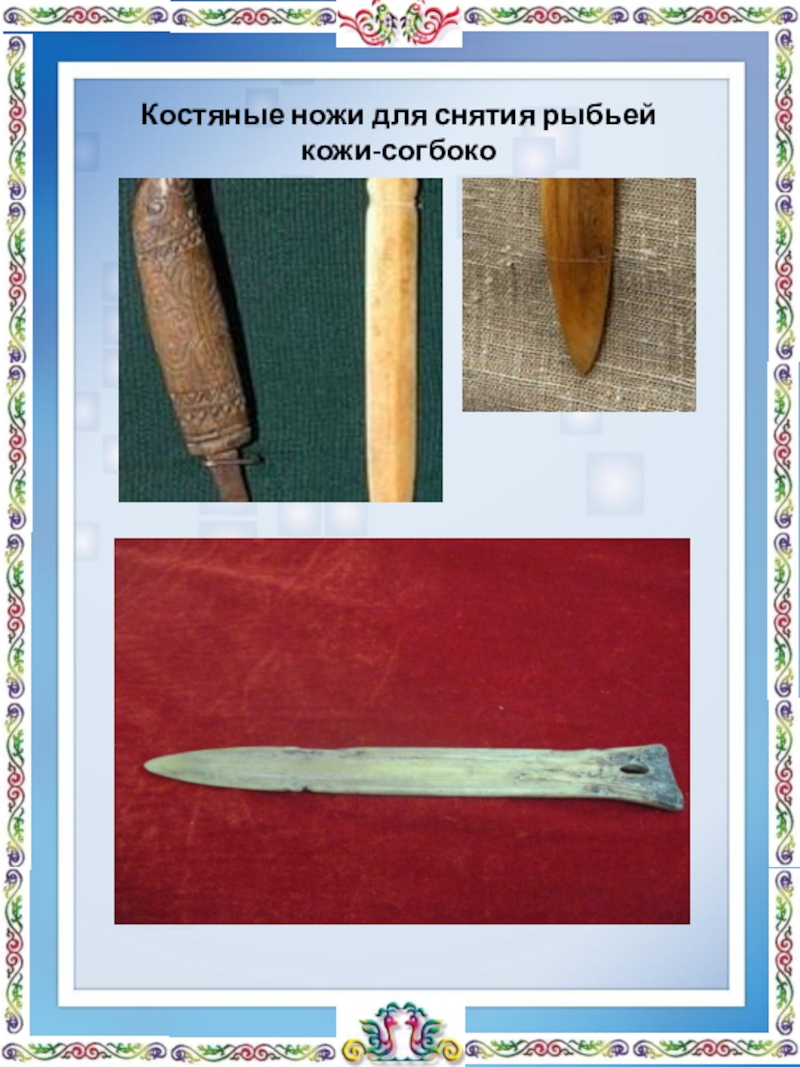 Слайд 21Костяные ножи для снятия рыбьей кожи-согбоко