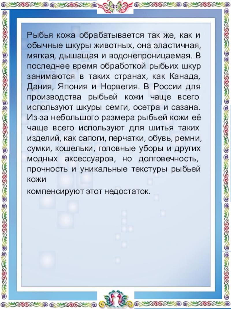 Слайд 4Рыбья кожа обрабатывается так же, как и обычные шкуры животных, она