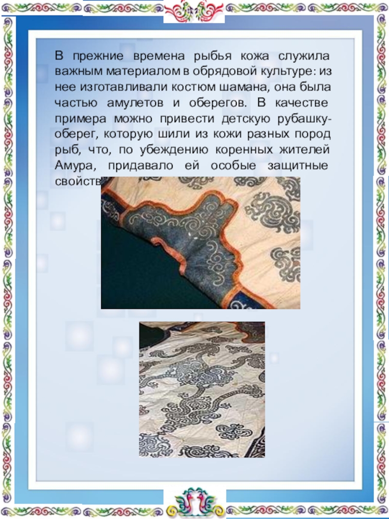 из нее изготавливали костюм шамана, она была частью амулетов и оберегов. В качестве примера можно привести детскую рубашку-оберег, которую шили из кожи разных пород рыб, что, по убеждению коренных жителей Амура, придавало ей особые защитные свойства.
