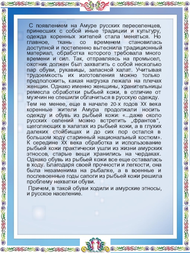 традиции и культуру, одежда коренных жителей стала меняться. Но главное, ткань со временем становилась доступной и постепенно вытеснила традиционный материал, обработка которого требовала много времени и сил. Так, отправляясь на промысел, охотник должен был захватить с собой несколько пар обуви, рукавицы, запасной халат. Учитывая трудоемкость их изготовления можно только предположить, какая нагрузка лежала на плечах женщин. Однако именно женщины, хранительницы ремесла обработки рыбьей кожи, в отличие от мужчин не спешили облачиться в русскую одежду.