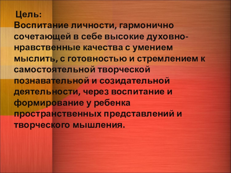 с умением мыслить, с готовностью и стремлением к самостоятельной творческой познавательной и созидательной деятельности, через воспитание и формирование у ребенка пространственных представлений и творческого мышления.