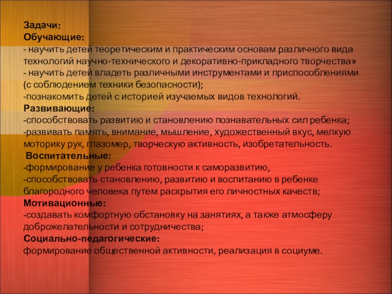 Задачи: Обучающие: - научить детей теоретическим и практическим основам различного вида технологий научно-технического и декоративно-прикладного творчества» -