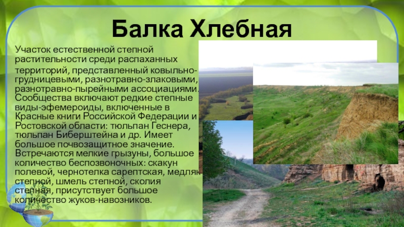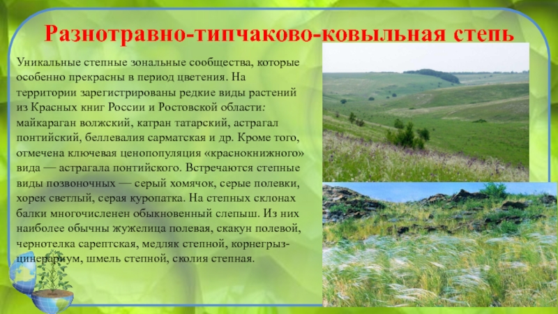 разнотравно-пырейными ассоциациями. Сообщества включают редкие степные виды-эфемероиды, включенные в Красные книги Российской Федерации и Ростовской области: тюльпан Геснера, тюльпан Биберштейна и др. Имеет большое почвозащитное значение. Встречаются мелкие грызуны, большое количество беспозвоночных: скакун полевой, чернотелка сарептская, медляк степной, шмель степной, сколия степная, присутствует большое количество жуков-навозников.