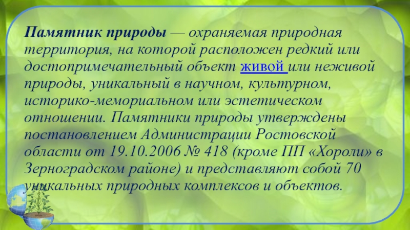 Слайд 2Памятник природы — охраняемая природная территория, на которой расположен редкий или достопримечательный