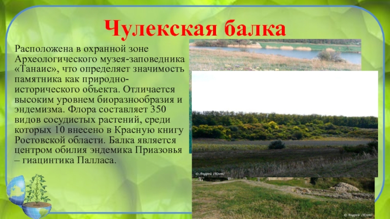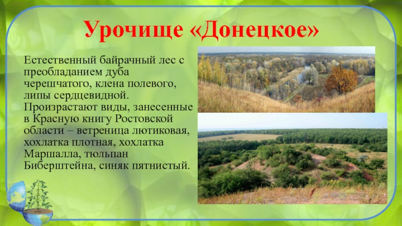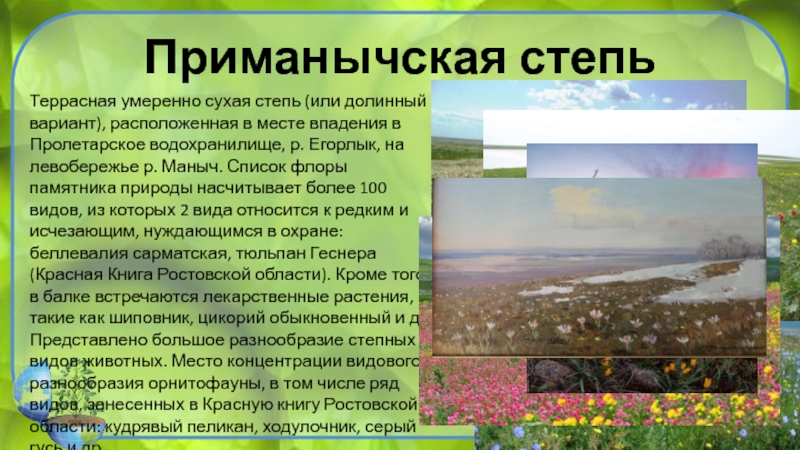 степей. Заповедная степь, где сохранились многие редкие виды растений, занесенные в Красные книги Российской Федерации и Ростовской области: ковыли украинский и красивейший, тюльпаны Геснера и Биберштейна и др. В памятник природы входит также лес – дубрава им. Докучаева – противоэрозионный и почвозащитный лесной массив как опыт лесоразведения по методу В.В. Докучаева.