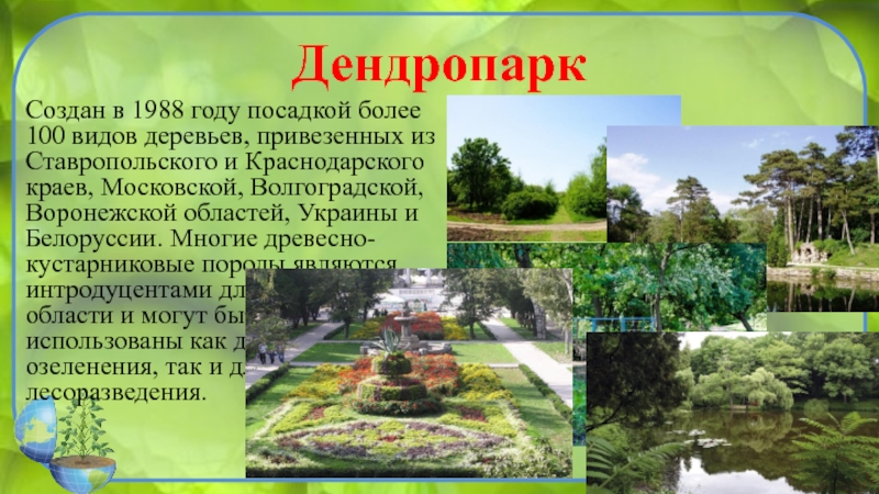 Ставропольского и Краснодарского краев, Московской, Волгоградской, Воронежской областей, Украины и Белоруссии. Многие древесно-кустарниковые породы являются интродуцентами для Ростовской области и могут быть в дальнейшем использованы как для целей озеленения, так и для массового лесоразведения.