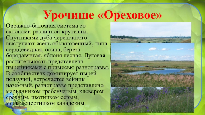 Овражно-балочная система со склонами различной крутизны. Спутниками дуба черешчатого выступают