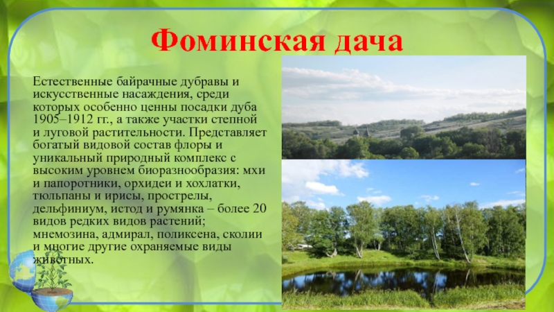 посадки дуба 1905–1912 гг., а также участки степной и луговой растительности. Представляет богатый видовой состав флоры и уникальный природный комплекс с высоким уровнем биоразнообразия: мхи и папоротники, орхидеи и хохлатки, тюльпаны и ирисы, прострелы, дельфиниум, истод и румянка – более 20 видов редких видов растений; мнемозина, адмирал, поликсена, сколии и многие другие охраняемые виды животных.