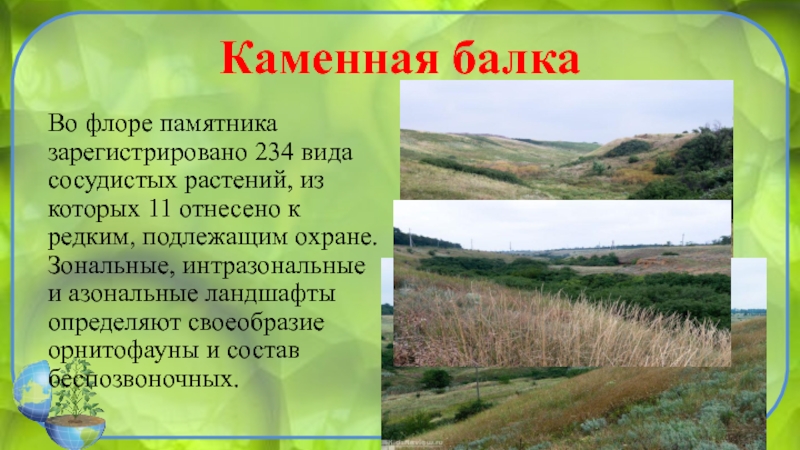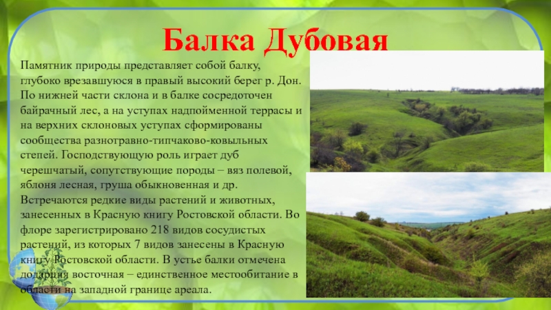 определяются особенности природных комплексов. Сочетания байрачного леса в балке, целинной и залежной степной растительности на прибалочных склонах. 10 видов растений занесено в Красные книги Российской Федерации и Ростовской области: прострел луговой, ковыль перистый, тюльпан Геснера, тюльпан Биберштейна, астрагал донской, касатик карликовый, эгонихон пурпурно-голубой и др.
