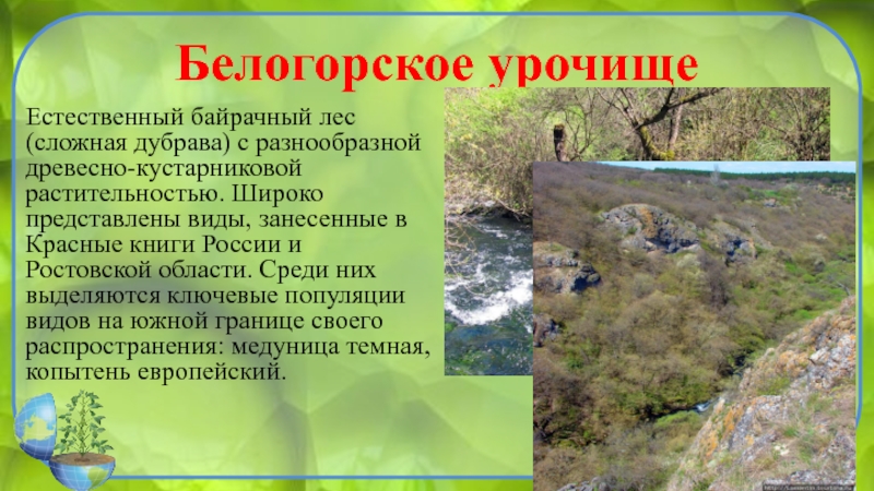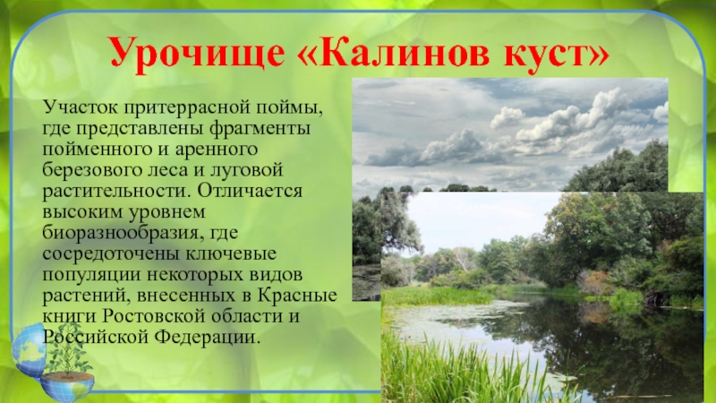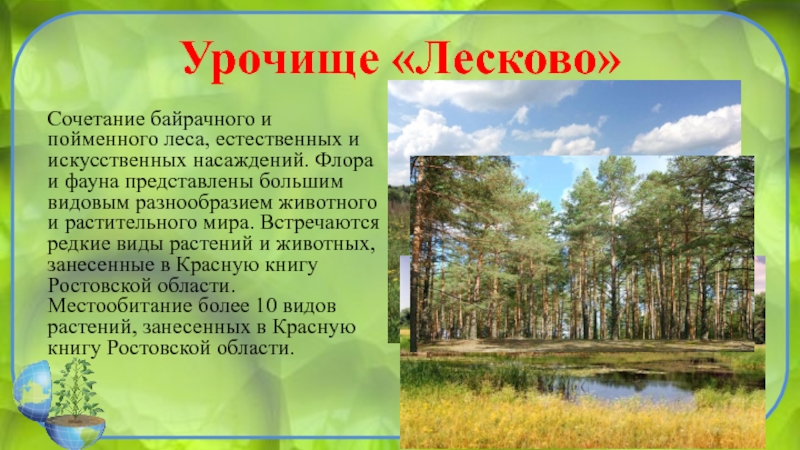 березового леса и луговой растительности. Отличается высоким уровнем биоразнообразия, где сосредоточены ключевые популяции некоторых видов растений, внесенных в Красные книги Ростовской области и Российской Федерации.