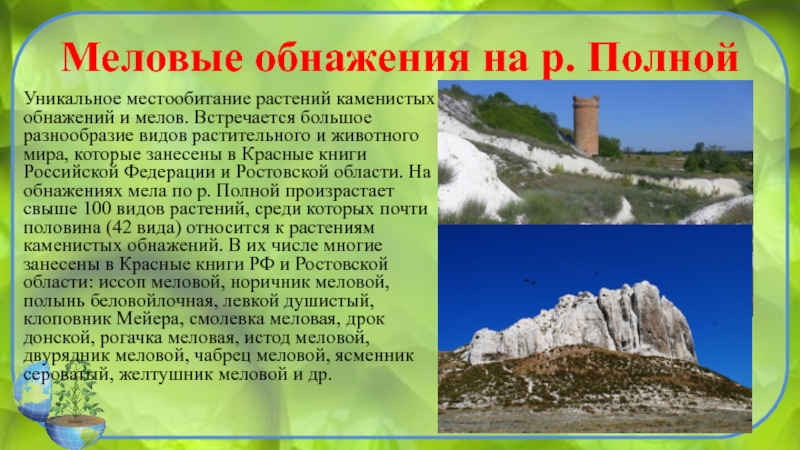 Встречается большое разнообразие видов растительного и животного мира, которые занесены в Красные книги Российской Федерации и Ростовской области. На обнажениях мела по р. Полной произрастает свыше 100 видов растений, среди которых почти половина (42 вида) относится к растениям каменистых обнажений. В их числе многие занесены в Красные книги РФ и Ростовской области: иссоп меловой, норичник меловой, полынь беловойлочная, левкой душистый, клоповник Мейера, смолевка меловая, дрок донской, рогачка меловая, истод меловой, двурядник меловой, чабрец меловой, ясменник сероватый, желтушник меловой и др.