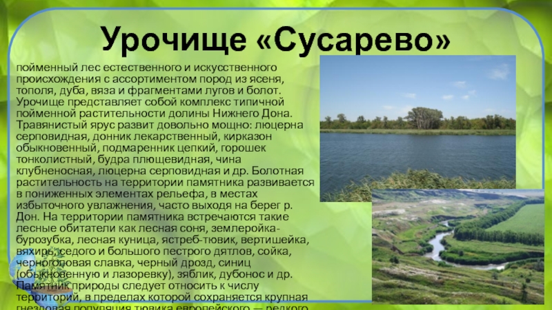 ясеня, тополя, дуба, вяза и фрагментами лугов и болот. Урочище представляет собой комплекс типичной пойменной растительности долины Нижнего Дона. Травянистый ярус развит довольно мощно: люцерна серповидная, донник лекарственный, кирказон обыкновенный, подмаренник цепкий, горошек тонколистный, будра плющевидная, чина клубненосная, люцерна серповидная и др. Болотная растительность на территории памятника развивается в пониженных элементах рельефа, в местах избыточного увлажнения, часто выходя на берег р. Дон. На территории памятника встречаются такие лесные обитатели как лесная соня, землеройка-бурозубка, лесная куница, ястреб-тювик, вертишейка, вяхирь, седого и большого пестрого дятлов, сойка, черноголовая славка, черный дрозд, синиц (обыкновенную и лазоревку), зяблик, дубонос и др. Памятник природы следует относить к числу территорий, в пределах которой сохраняется крупная гнездовая популяция тювика европейского — редкого вида хищных птиц, занесенного в Красные Книги России и Ростовской области.