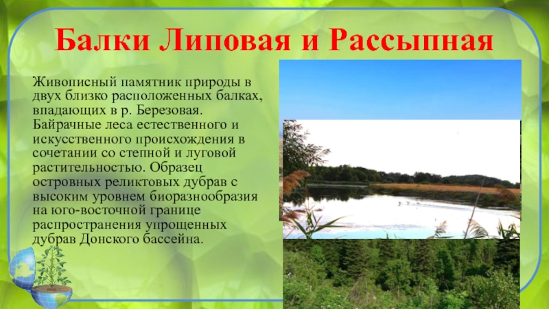 впадающих в р. Березовая. Байрачные леса естественного и искусственного происхождения в сочетании со степной и луговой растительностью. Образец островных реликтовых дубрав с высоким уровнем биоразнообразия на юго-восточной границе распространения упрощенных дубрав Донского бассейна.