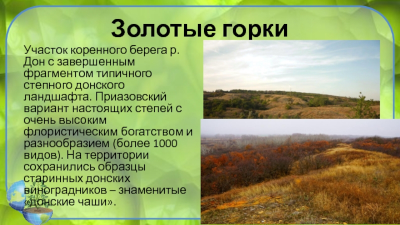 донского ландшафта. Приазовский вариант настоящих степей с очень высоким флористическим богатством и разнообразием (более 1000 видов). На территории сохранились образцы старинных донских виноградников – знаменитые «донские чаши».