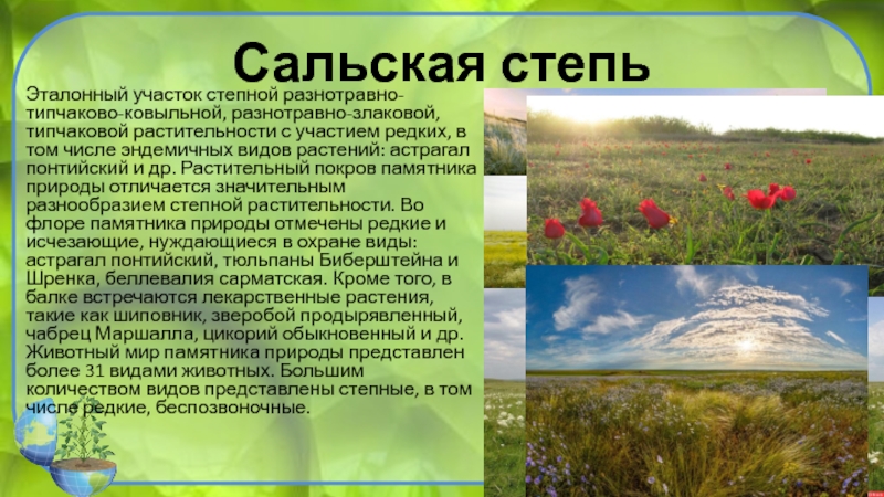 фрагментами целинной степи с ковыльной и разнотравно-злаковой растительностью. Имеются редкие растения: гиацинтик Палласа, карагана скифская, тюльпан Биберштейна, богат мир беспозвоночных.