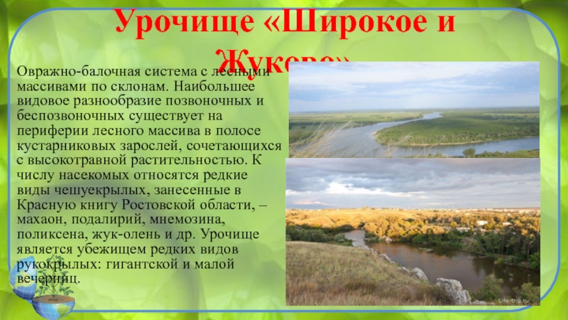 берег р. Дон. По нижней части склона и в балке сосредоточен байрачный лес, а на уступах надпойменной террасы и на верхних склоновых уступах сформированы сообщества разнотравно-типчаково-ковыльных степей. Господствующую роль играет дуб черешчатый, сопутствующие породы – вяз полевой, яблоня лесная, груша обыкновенная и др. Встречаются редкие виды растений и животных, занесенных в Красную книгу Ростовской области. Во флоре зарегистрировано 218 видов сосудистых растений, из которых 7 видов занесены в Красную книгу Ростовской области. В устье балки отмечена додарция восточная – единственное местообитание в области на западной границе ареала.