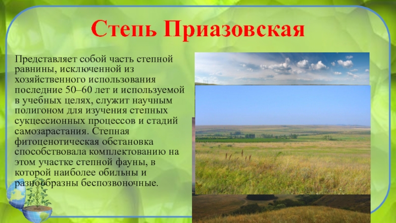 50–60 лет и используемой в учебных целях, служит научным полигоном для изучения степных сукцессионных процессов и стадий самозарастания. Степная фитоценотическая обстановка способствовала комплектованию на этом участке степной фауны, в которой наиболее обильны и разнообразны беспозвоночные.