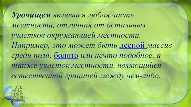Слайд 3Урочищем является любая часть местности, отличная от остальных участков окружающей местности. Например,