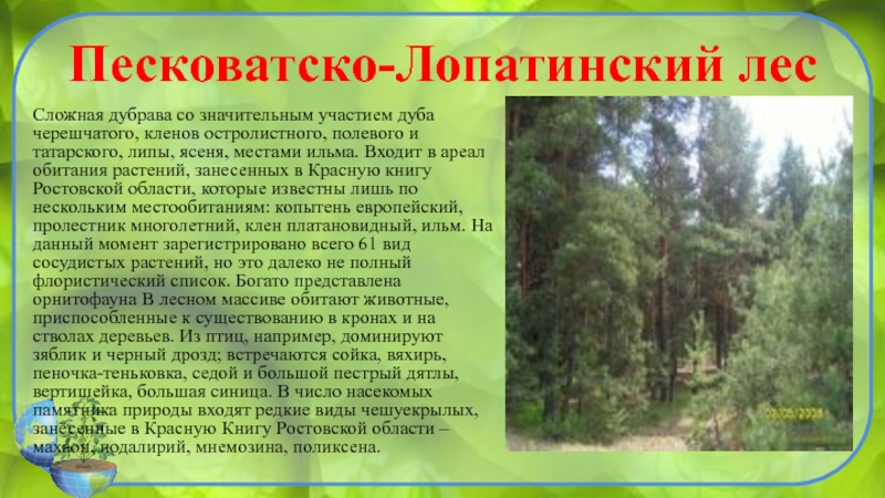 и татарского, липы, ясеня, местами ильма. Входит в ареал обитания растений, занесенных в Красную книгу Ростовской области, которые известны лишь по нескольким местообитаниям: копытень европейский, пролестник многолетний, клен платановидный, ильм. На данный момент зарегистрировано всего 61 вид сосудистых растений, но это далеко не полный флористический список. Богато представлена орнитофауна В лесном массиве обитают животные, приспособленные к существованию в кронах и на стволах деревьев. Из птиц, например, доминируют зяблик и черный дрозд; встречаются сойка, вяхирь, пеночка-теньковка, седой и большой пестрый дятлы, вертишейка, большая синица. В число насекомых памятника природы входят редкие виды чешуекрылых, занесенные в Красную Книгу Ростовской области – махаон, подалирий, мнемозина, поликсена.