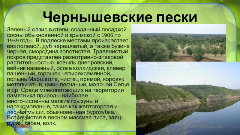 с 1906 по 1939 годы. В подлеске местами произрастает вяз полевой, дуб черешчатый, а также бузина черная, смородина золотистая. Травянистый покров представлен разнотравно-злаковой растительностью: ковыль днепровский, вейник наземный, осока колхидская, клевер пашенный, горошек четырехсемянной, полынь Маршалла, чистец прямой, коровяк метельчатый, цмин песчаный, молочай Сегье и др. Среди млекопитающих на территории памятника природы наиболее многочисленны мелкие грызуны и насекомоядные, такие как желтогорлая и лесная мыши, обыкновенная бурозубка. Встречаются в лесном массиве лиса, заяц-русак, кабан, волк.