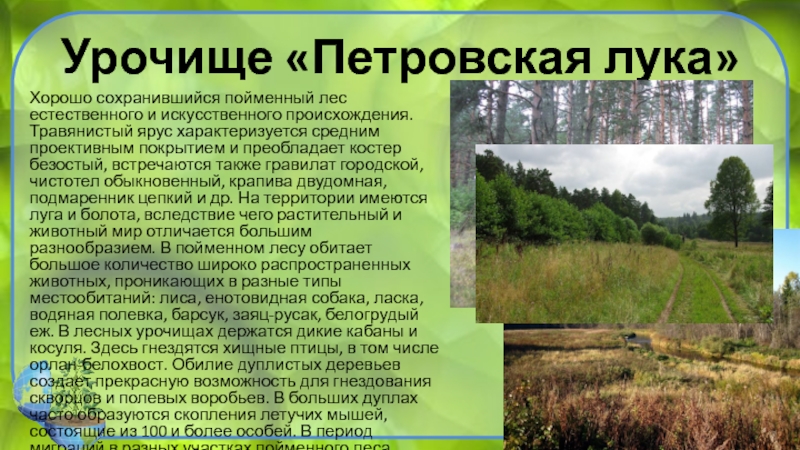 ХIХ века. Ценные лесонасаждения почвозащитной группы и южная граница сложных дубрав . Обилие мелких млекопитающих привлекает в урочище разнообразных хищников. К числу главных факторов, создающих здесь условия, благоприятные для лесных животных, следует отнести высокое и достаточно стабильное увлажнение пойменной дубравы, её значительную площадь и наличие луговых полян, существенно расширяющих «экологическую ёмкость» памятника природы.