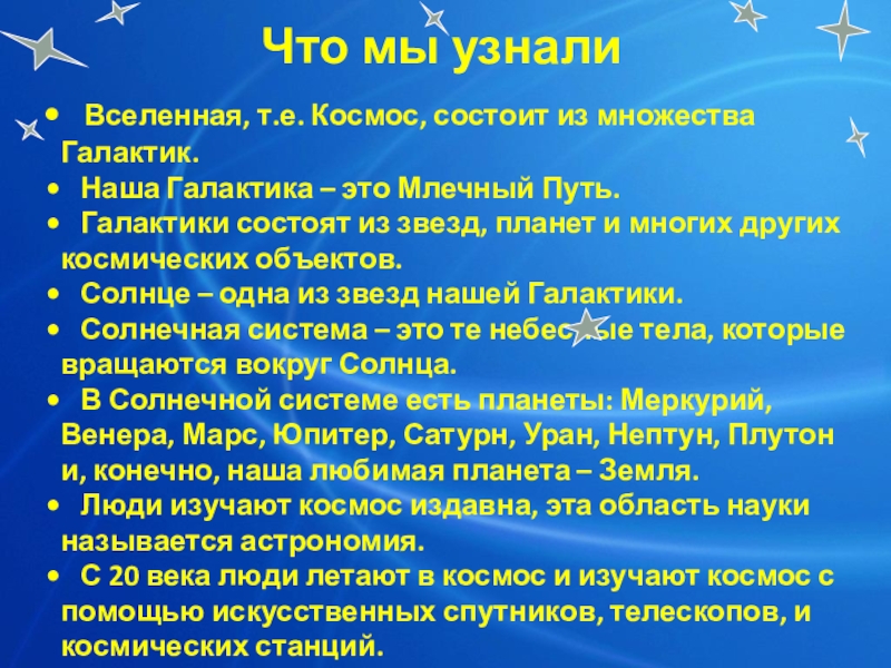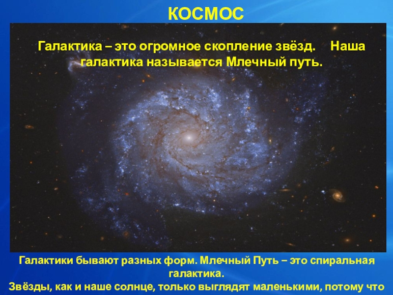 Галактика – это огромное скопление звёзд. Наша галактика называется Млечный путь.