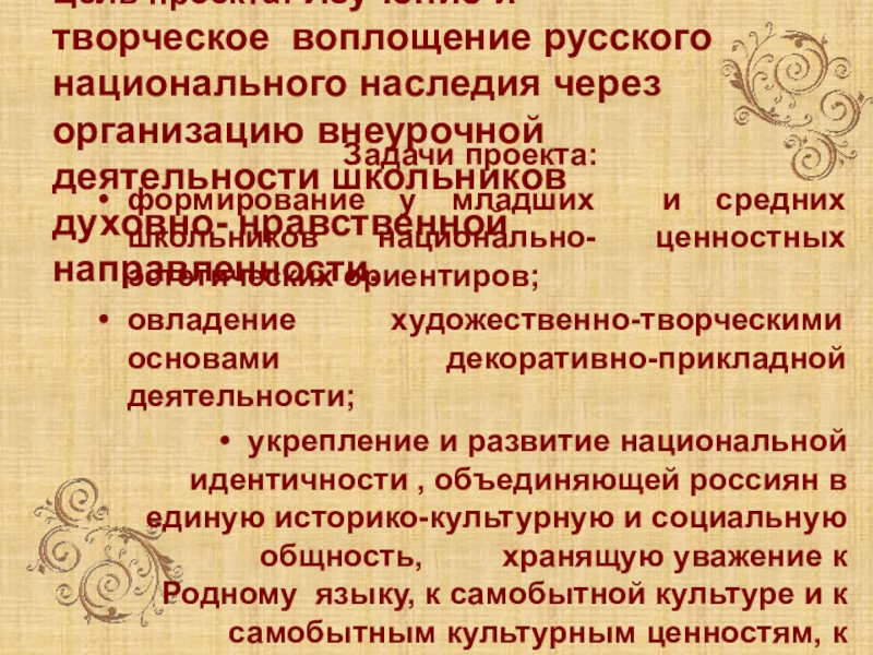 укрепление и развитие национальной идентичности , объединяющей россиян в единую историко-культурную и социальную общность, хранящую уважение к Родному языку, к самобытной культуре и к самобытным культурным ценностям, к памяти своих предков, опираясь на национальные традиции.