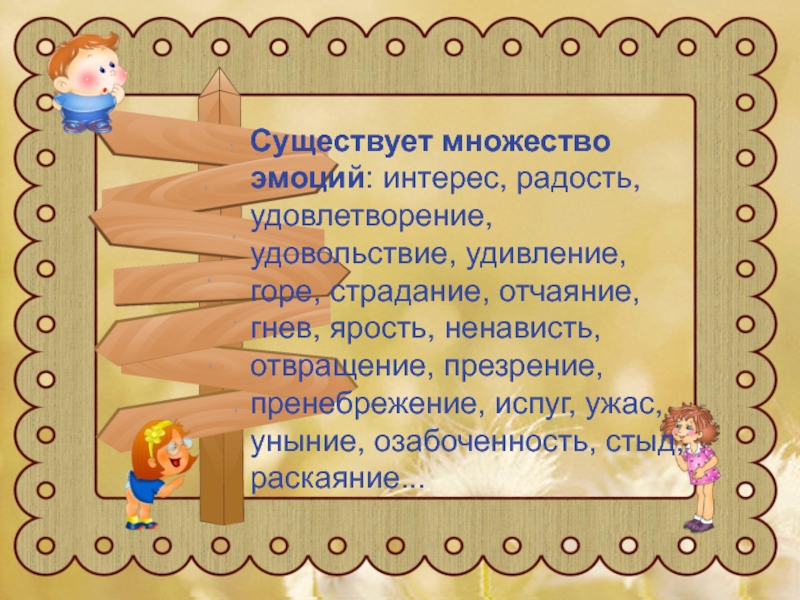 Существует множество эмоций: интерес, радость, удовлетворение, удовольствие, удивление, горе, страдание, отчаяние, гнев, ярость, ненависть, отвращение, презрение, пренебрежение, испуг, ужас, уныние, озабоченность, стыд, раскаяние...