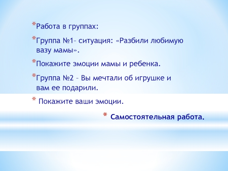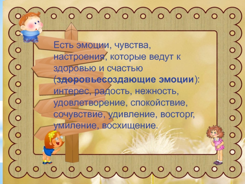 Есть эмоции, чувства, настроения, которые ведут к здоровью и счастью (здоровьесоздающие эмоции): интерес, радость, нежность, удовлетворение, спокойствие, сочувствие, удивление, восторг, умиление, восхищение.