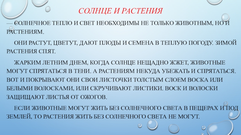 Жарким летним днем, когда Солнце нещадно жжет, животные могут спрятаться в тени. А растениям некуда убежать и спрятаться. Вот и покрывают они свои листочки толстым слоем воска или белыми волосками, или скручивают листики. Воск и волоски защищают листья от ожогов.