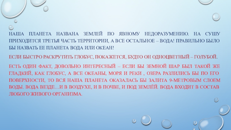 часть территории, а все остальное – вода! Правильно было бы назвать ее планета Вода или Океан!