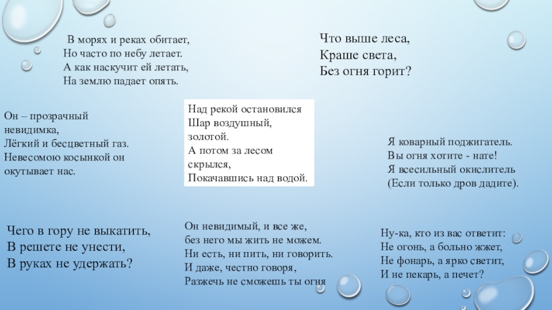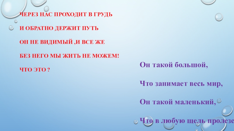 Вся планета Земля окутана невидимым прозрачным покрывалом- воздухом. Воздух есть везде – на улице, в комнате, в земле, в воде. Любое свободное пространство на Земле заполнено воздухом. Воздух невидим, но его можно обнаружить с помощью наших органов чувств: зрения, слуха, осязания.